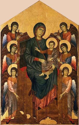 下面这幅卢浮宫的 «宝座上被六个天使环绕的圣母子»,具有重要的艺术史价值,由契马布埃于13世纪下半叶绘制。此画还留存着拜占庭绘画比较呆板的风格,但已带有意大利文艺复兴的前奏。虽然还有小大人的痕迹,但是里面的小耶稣已经显得比较人性化了。