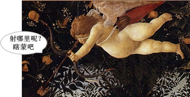 小爱神经常背着弓箭到处调皮。下面这幅是文艺复兴大师,波提切利的经典之作«春»。维纳斯头上那只飞翔的圆肚子小天使,就是丘比特。有时还蒙眼射箭,由这么个小屁孩来掌管的爱情能不盲目吗?